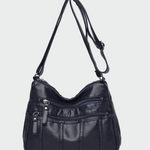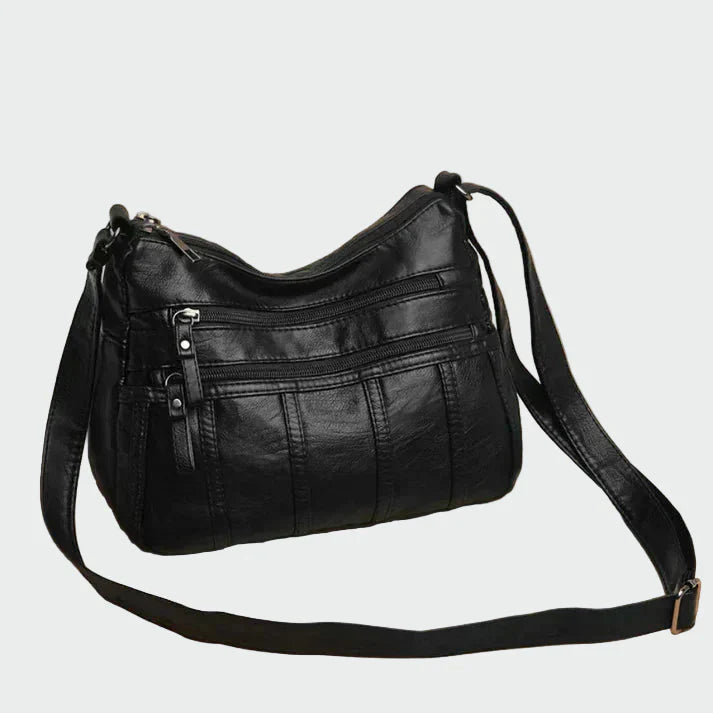 Πρακτική τσάντα χιαστί σε μαύρη απόχρωση με μαλακή υφή και λειτουργικό σχεδιασμό. Διαθέτει πολλαπλές εξωτερικές θήκες με φερμουάρ που προσφέρουν εύκολη οργάνωση και γρήγορη πρόσβαση στα απαραίτητα. Το ρυθμιζόμενο λουράκι επιτρέπει άνετη χρήση καθ’ όλη τη διάρκεια της ημέρας, καθιστώντας την ιδανική επιλογή για καθημερινές casual εμφανίσεις.