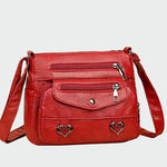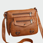 Vintage τσάντα χιαστί σε καφέ απόχρωση με μαλακή υφή και ρομαντικές λεπτομέρειες. Διαθέτει πολλαπλές εξωτερικές θήκες με φερμουάρ που προσφέρουν πρακτικότητα, ενώ τα μεταλλικά στοιχεία σε σχήμα καρδιάς χαρίζουν μοναδικό χαρακτήρα. Το ρυθμιζόμενο λουράκι επιτρέπει άνετη χρήση, καθιστώντας την ιδανική επιλογή για καθημερινές εμφανίσεις με ιδιαίτερο στυλ.