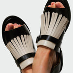Αυτά τα μοναδικά σανδάλια με ιδιαίτερο σχέδιο ξεχωρίζουν για τον πρωτοποριακό τους χαρακτήρα και την άνετη εφαρμογή. Ο συνδυασμός μαύρου και λευκού με κομψές λωρίδες δημιουργεί μια εντυπωσιακή εμφάνιση που αποπνέει στυλ και προσωπικότητα.