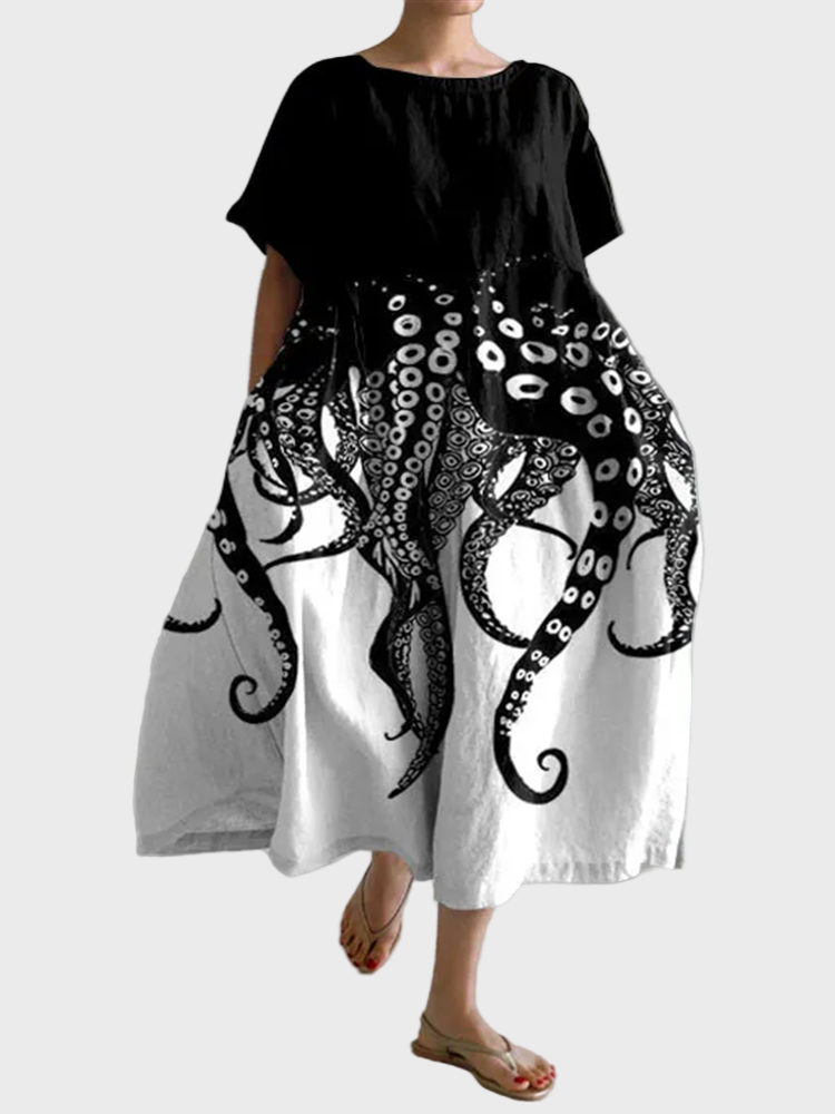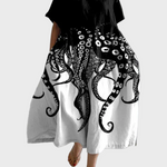 Το Ωκεάνιο Μυστήριο είναι ένα φόρεμα που συνδυάζει την κομψότητα με το τολμηρό design. Με μαύρο επάνω μέρος και λευκή βάση διακοσμημένη με εντυπωσιακό μοτίβο χταποδιού, δημιουργεί μια εμφάνιση που ξεχωρίζει και αιχμαλωτίζει τα βλέμματα.
