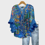 Αναδείξτε το καλλιτεχνικό σας στυλ με αυτήν τη μπλούζα σε έντονη μπλε απόχρωση, διακοσμημένη με πολύχρωμα αφηρημένα μοτίβα και λεπτομέρειες που θυμίζουν ζωγραφικό καμβά. Τα μανίκια με βολάν προσδίδουν κομψότητα και κίνηση, ενώ η άνετη γραμμή της την καθιστά ιδανική για καθημερινές και ξεχωριστές εμφανίσεις.