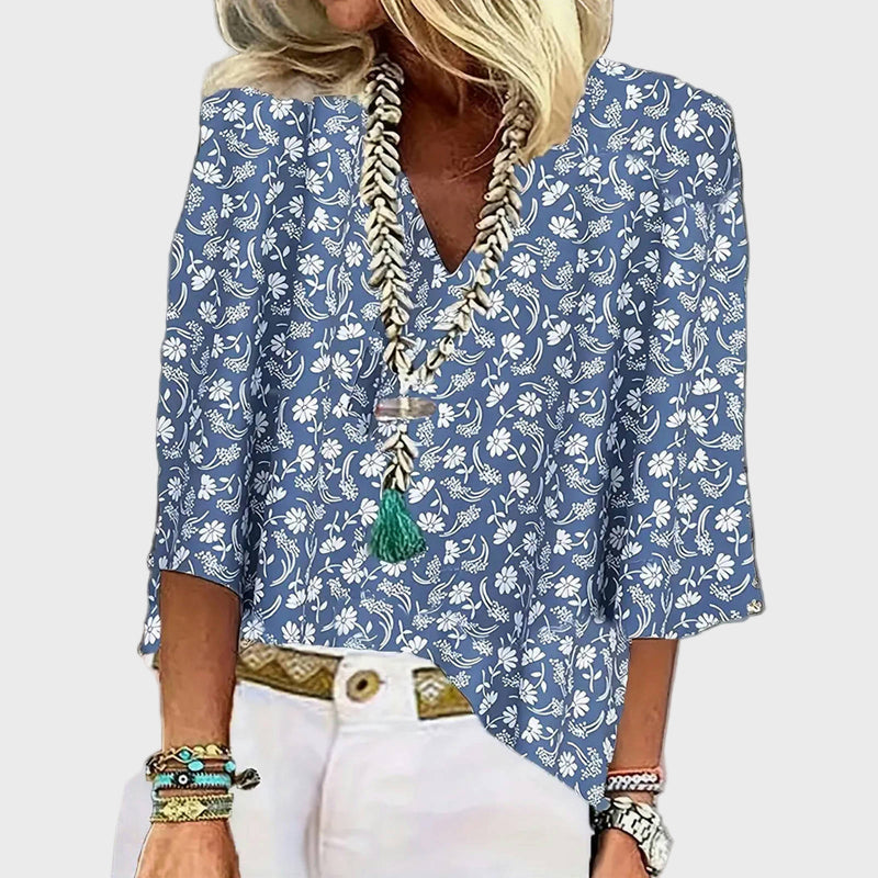 Ανανεώστε το καθημερινό σας ντύσιμο με αυτήν τη μπλούζα σε μπλε απόχρωση, διακοσμημένη με μικρά λευκά λουλουδάτα μοτίβα. Ο κλασικός της σχεδιασμός με τρία τέταρτα μανίκια χαρίζει άνεση και κομψότητα, ενώ η χαλαρή γραμμή την καθιστά ιδανική επιλογή για όλες τις ώρες της ημέρας.