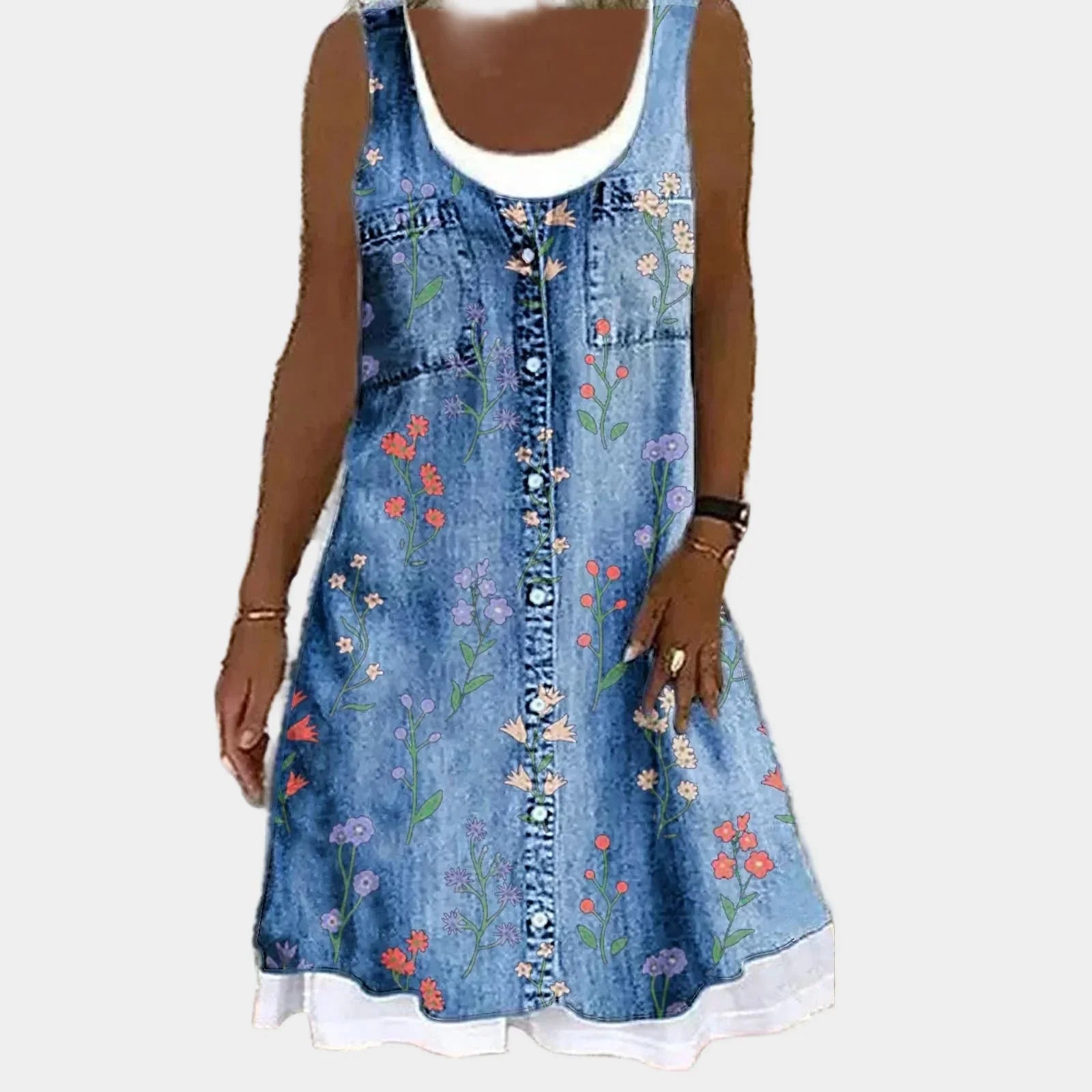 Δώστε στο καλοκαιρινό σας στυλ μια χαλαρή αλλά κομψή πινελιά με το Αμάνικο Τζιν Φόρεμα με Κουμπιά & Λεπτομέρεια Λουλουδιού. Άνετο και δροσερό, ταιριάζει σε κάθε περίσταση.