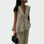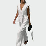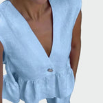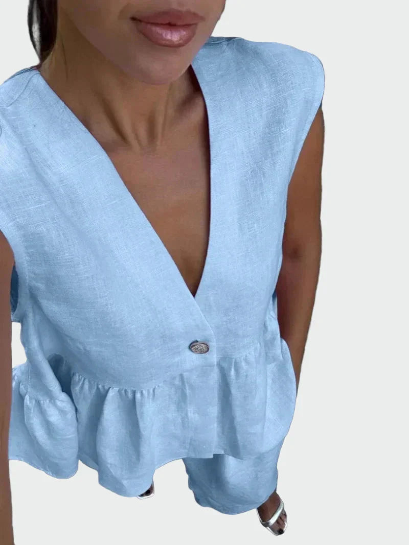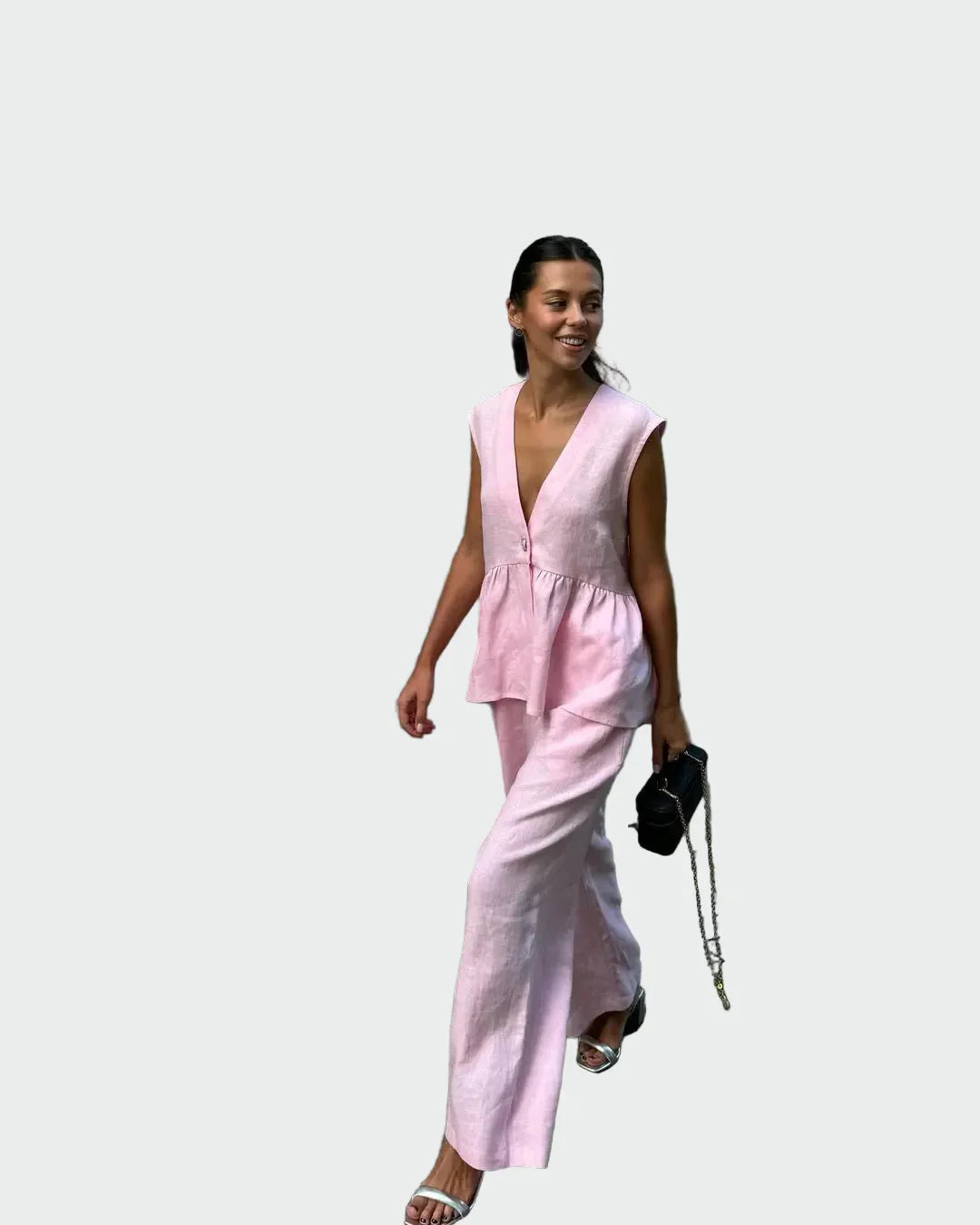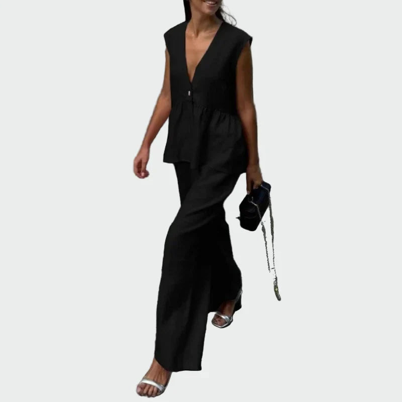 Δώστε μια ανάλαφρη αλλά κομψή αίσθηση στο στυλ σας με αυτό το ρευστό και αέρινο σετ. Ο μοντέρνος σχεδιασμός του συνδυάζει άνεση και φινέτσα, καθιστώντας το ιδανικό τόσο για καθημερινές εμφανίσεις όσο και για πιο ιδιαίτερες περιστάσεις. Το ελαφρύ ύφασμα χαρίζει δροσιά και ευκολία στην κίνηση, ενώ η κομψή του γραμμή προσδίδει θηλυκότητα και στυλ.