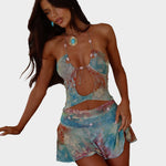 Αναδείξτε το καλοκαιρινό σας στυλ με αυτό το μίνι φόρεμα σε πολύχρωμο μοτίβο. Ο σχεδιασμός με ανοιχτή λαιμόκοψη και εντυπωσιακά κοψίματα μπροστά χαρίζει τολμηρή και θηλυκή εμφάνιση, ιδανική για νησιώτικες αποδράσεις και βραδινές εξόδους.
