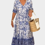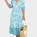 Αναδείξτε την κομψότητά σας με το Σχεδιασμένο με θηλυκή λαιμόκοψη V, απαλά σουφρώματα και κομμψά μανίκια 3/4, αυτό το φόρεμα συνδυάζει άνεση και στυλ σε απόλυτη αρμονία. Το μπλε λουλουδάτο μοτίβο πάνω σε λευκή βάση προσδίδει καλοκαιρινή φρεσκάδα και ρομαντισμό.