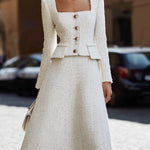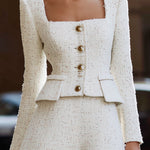 Αυτό το σετ από τουλί είναι η επιτομή της κομψότητας με τον προσεκτικό συνδυασμό κλασικής ραπτικής και σύγχρονης θηλυκότητας. Το σακάκι με τετράγωνη λαιμόκοψη, διακοσμημένο με χρυσά κουμπιά, κολακεύει την περιοχή του λαιμού ενώ σφίγγει κομψά στη μέση με λεπτομέρεια peplum. Συνδυασμένο με μια φουστάνι A-line, η σιλουέτα αποπνέει effortless sophistication και κίνηση.