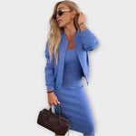 Ανανεώστε την εμφάνισή σας με αυτό το κομψό σετ που συνδυάζει απόλυτα τη θηλυκότητα με τον επαγγελματισμό. Το εφαρμοστό φόρεμα αγκαλιάζει τη σιλουέτα, ενώ το σακάκι προσθέτει μια σοφιστικέ πινελιά που απογειώνει το look σας. Ιδανικό για το γραφείο, εξόδους στην πόλη ή μια κομψή εμφάνιση από το πρωί έως το βράδυ.
