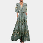 μάξι φόρεμα με κεντημένα λουλούδια είναι μια ωδή στη ρομαντική κομψότητα. Με βαθύ ντεκολτέ, ζώνη που τονίζει τη μέση και ανάλαφρη γραμμή, αυτό το φόρεμα μετατρέπει κάθε σας εμφάνιση σε ξεχωριστή στιγμή. Ιδανικό για γάμους, επίσημα δείπνα ή ρομαντικές βραδιές