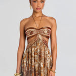 Εντυπωσιακό μάξι φόρεμα με πλούσιο παϊσλέ μοτίβο σε αποχρώσεις του χρυσού, του καφέ και του κεραμιδί. Το στράπλες μπούστο με εντυπωσιακή κοπή και κομψά ανοίγματα αναδεικνύει τη θηλυκότητα, ενώ η αέρινη φούστα χαρίζει κίνηση και κομψότητα. Ιδανικό για βραδινές εξόδους, κοκτέιλ πάρτι και καλοκαιρινές περιστάσεις που απαιτούν glam εμφάνιση.