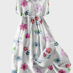 Αυτό το χαριτωμένο μάξι φόρεμα αποπνέει μια ανοιξιάτικη και παιχνιδιάρικη διάθεση, με λευκή βάση που αναδεικνύεται από πολύχρωμα λουλουδάτα σχέδια και διακριτικές πεταλούδες. Η άνετη εφαρμογή του και η ανάλαφρη υφή το καθιστούν ιδανικό για καθημερινές εμφανίσεις και χαλαρές βόλτες.