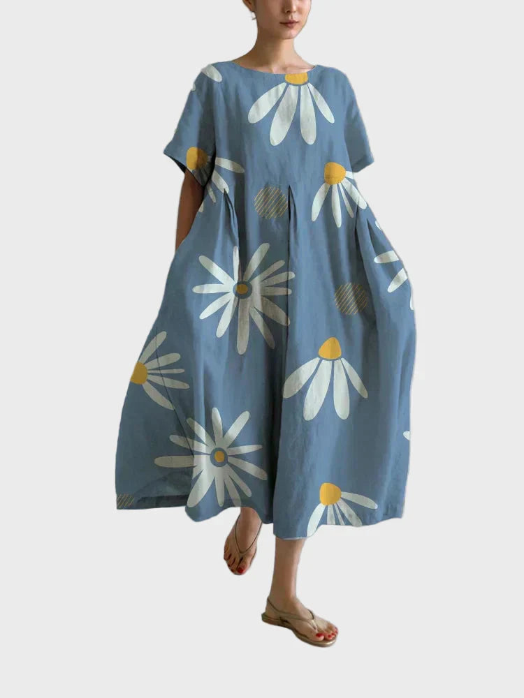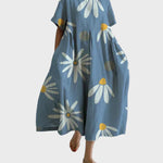 Αναδείξτε την καλοκαιρινή σας διάθεση με το Blue Daisy Breeze Dress. Το αέρινο γαλάζιο ύφασμα με τα μεγάλα λουλούδια μαργαρίτας δημιουργεί ένα χαρούμενο και θηλυκό look που συνδυάζει άνεση και στυλ.