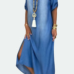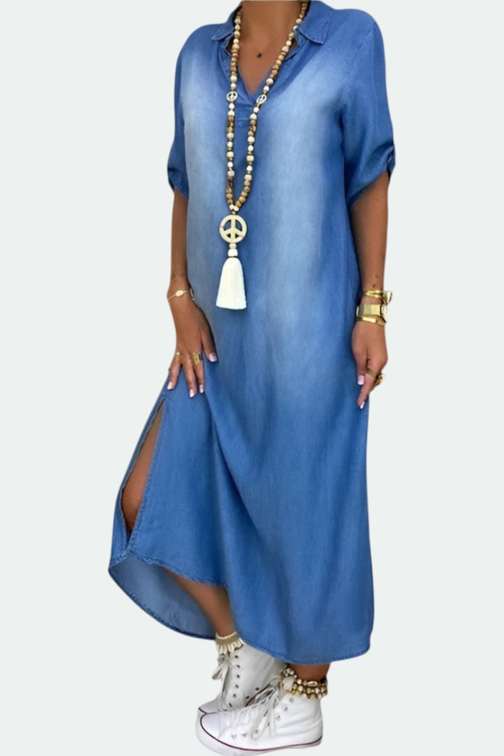 LEA είναι το μακρύ τζιν φόρεμα που φοράς χωρίς δεύτερη σκέψη: ιδανικό για δυναμικές μέρες, τη δουλειά ή απλώς για να χαλαρώσεις με στυλ. Η αέρινη γραμμή, τα γυριστά κοντά μανίκια και το πλαϊνό άνοιγμα προσφέρουν ελευθερία κινήσεων και μια θηλυκή πινελιά σε κάθε περίσταση.