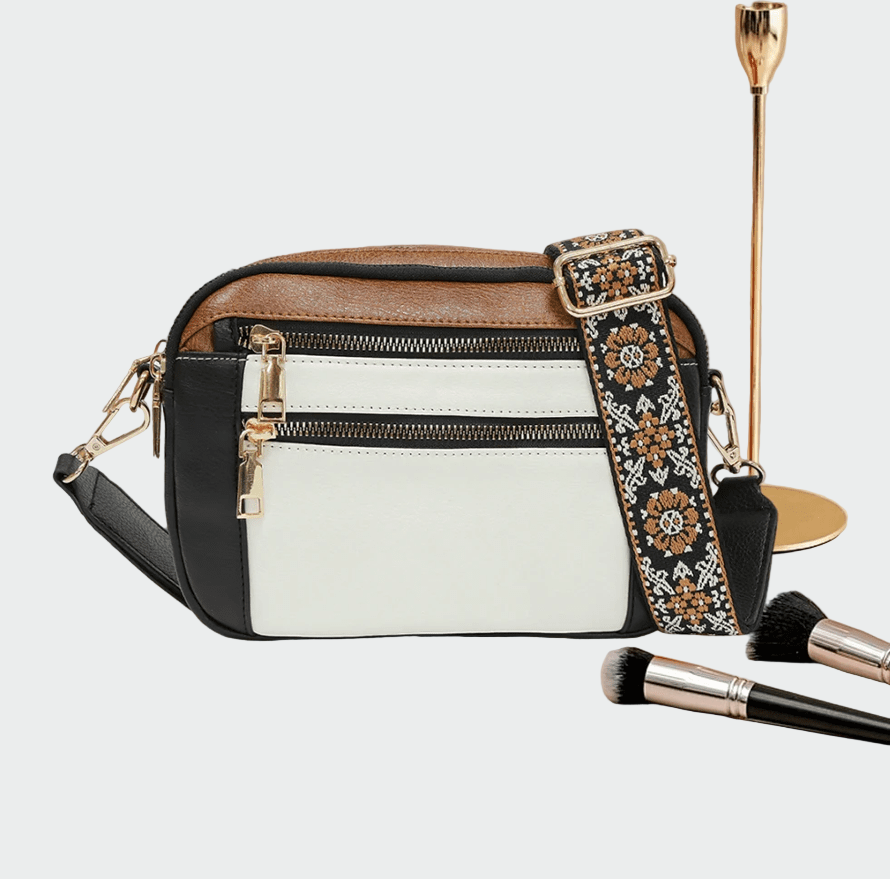 Κομψή τσάντα ώμου σε μαύρη απόχρωση με μοντέρνο και πρακτικό σχεδιασμό. Διαθέτει δύο εξωτερικά φερμουάρ με μεταλλικές λεπτομέρειες σε χρυσό, που προσθέτουν πολυτέλεια και λειτουργικότητα. Η φαρδιά, υφασμάτινη λωρίδα με εντυπωσιακό μοτίβο χαρίζει μοναδικό χαρακτήρα και άνεση στη μεταφορά. Ιδανική για καθημερινή χρήση αλλά και για πιο ιδιαίτερες εμφανίσεις.