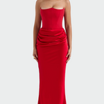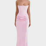 Ένα εντυπωσιακό και αισθησιακό φόρεμα με strapless μπούστο και εφαρμοστή γραμμή που αναδεικνύει τη σιλουέτα. Η λεπτομέρεια με τις κομψές πιέτες στη μέση χαρίζει θηλυκότητα και μοναδική ροή, ενώ το μάξι μήκος προσδίδει διαχρονική κομψότητα. Ιδανικό για επίσημες βραδιές και λαμπερές εμφανίσεις.