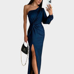 • Elegant One-Shoulder Cut: A unique asymmetrical neckline that adds a bold and refined edge.