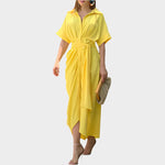 προσφέρει έναν μοναδικό συνδυασμό κλασικού πουκαμίσου και κομψής σιλουέτας. Με το παιχνιδιάρικο πράσινο μοτίβο, κουμπιά σε όλο το μήκος και ζώνη που τονίζει τη μέση, είναι ιδανικό για καλοκαιρινές εμφανίσεις που ξεχωρίζουν.