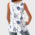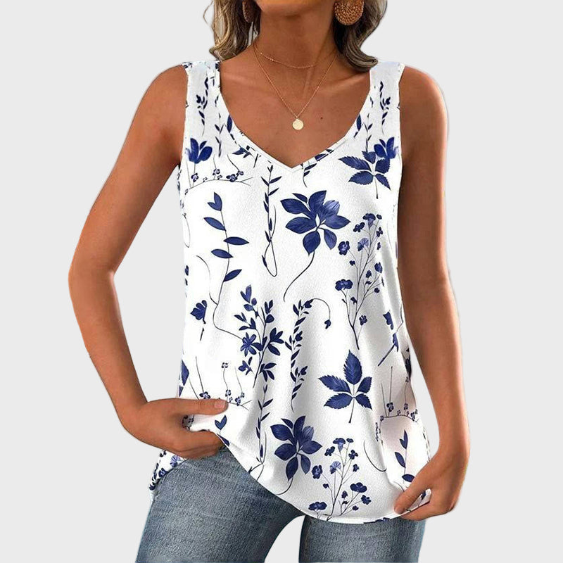 Απολαύστε τη φρεσκάδα του καλοκαιριού με αυτό το αμάνικο τοπ σε λευκή βάση, διακοσμημένο με μπλε λουλουδάτα μοτίβα. Η χαλαρή γραμμή του προσφέρει άνεση και ελευθερία κινήσεων, ενώ το ντεκολτέ σε σχήμα V χαρίζει θηλυκότητα και κομψότητα. Ένα ιδανικό κομμάτι για καθημερινές και καλοκαιρινές εμφανίσεις.