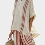Χαλάρωση με θαλάσσιο χαρακτήρα. Το κοστούμι Daisy συνδυάζει μια μπλούζα με φαρδύ κόψιμο και V λαιμόκοψη με παντελόνια φαρδιάς γραμμής με κατακόρυφες ρίγες που επιμηκύνουν τη σιλουέτα. Ο ρευστός σχεδιασμός του και το υφασμάτινο υλικό το καθιστούν την ιδανική επιλογή για να απολαύσετε φωτεινές μέρες με άνεση και στυλ.