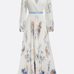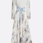 είναι η επιτομή της θηλυκής φινέτσας. Με βαθύ ντεκολτέ, ελαφριά πλισέ υφή και διακριτικό λουλουδάτο μοτίβο, προσφέρει αέρινη κίνηση και αριστοκρατικό στυλ. Η λεπτή μπλε ζώνη στη μέση αναδεικνύει τη σιλουέτα, χαρίζοντας κομψότητα σε κάθε βήμα.