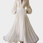 λευκό μάξι φόρεμα με balloon μανίκια ενσαρκώνει την απόλυτη φινέτσα και διαχρονικό στυλ. Με βαθύ V ντεκολτέ, αέρινη γραμμή και εντυπωσιακά μακριά μανίκια, είναι ιδανικό για κάθε ξεχωριστή στιγμή – από γάμους και επίσημα events μέχρι ρομαντικά βράδια.