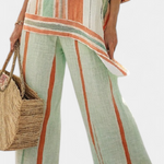 Καλοκαιρινή φρεσκάδα με καλλιτεχνική αίσθηση. Το σύνολο Daisy συνδυάζει μια μπλούζα με πολύχρωμες ρίγες με μαλακή και ασύμμετρη γραμμή και φαρδιά παντελόνια σε συνδυασμό. Ένα άνετο στυλ που αποπνέει προσωπικότητα και χρώμα.