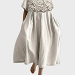 Αναδείξτε τη φυσική σας κομψότητα με αυτό το midi φόρεμα σε μπεζ απόχρωση, διακοσμημένο με εντυπωσιακά 3D λουλούδια στο επάνω μέρος. Η χαλαρή του γραμμή προσφέρει άνεση, ενώ οι λεπτομέρειες με πιέτες δημιουργούν μια αέρινη και θηλυκή σιλουέτα. Ιδανικό για καθημερινές αλλά και πιο ξεχωριστές εμφανίσεις.