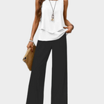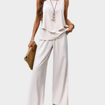 Αποπνεύστε φρεσκάδα και στυλ με αυτό το δροσερό γυναικείο σετ που συνδυάζει μια κομψή αμάνικη μπλούζα με φαρδύ παντελόνι με φύλλα. Ιδανικό για ζεστές μέρες, χαλαρές εξόδους ή διακοπές, προσφέρει μοναδική άνεση και φίνο look.
