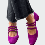 Αυτές οι μωβ γόβες με τριπλά λουράκια προσφέρουν έναν συνδυασμό κομψότητας και παιχνιδιάρικης διάθεσης. Το τετράγωνο σχήμα στη μύτη και το χαμηλό τακούνι χαρίζουν σταθερότητα και άνεση, ενώ το έντονο χρώμα αποτελεί δήλωση στυλ. Μπορούν να φορεθούν τόσο σε καθημερινές εμφανίσεις όσο και σε πιο ιδιαίτερες περιστάσεις.