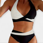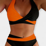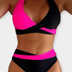 Αυτό το σέξι μπικίνι δύο κομματιών εντυπωσιάζει με τη λιτή του γραμμή και τη σταυρωτή λεπτομέρεια στο ντεκολτέ. Αναδεικνύει τη θηλυκότητα με διακριτικό τρόπο, ιδανικό για κομψές εμφανίσεις στην παραλία ή τις καλοκαιρινές σου αποδράσεις.