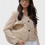Η τσάντα Μωβ προσφέρει μια απαλή υφή και έναν γλυπτικό γοητευτικό χαρακτήρα στο καθημερινό σου στυλ. Κατασκευασμένη από πολυτελή σουέτ με υφασμένη επιφάνεια, η λεπτομέρεια του κόμπου προσθέτει μια νότα διακριτικής κομψότητας. Είτε πηγαίνεις για δείπνο είτε αντιμετωπίζεις μια πολυάσχολη μέρα, η Μωβ προσφέρει την ιδανική ισορροπία μεταξύ λειτουργικότητας και εκλεπτυσμένου σχεδιασμού.