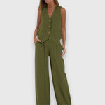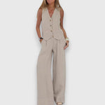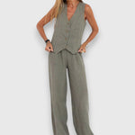 Το σετ Νίνα συνδυάζει την καλοκαιρινή ελαφρότητα με την κομψή απλότητα – ιδανικό για ζεστές ημέρες και στιλάτες εμφανίσεις. Το αμάνικο τοπ σε στενή γραμμή συναντά ένα χαλαρό παντελόνι, προσφέροντας έτσι μια μοντέρνα, κολακευτική σιλουέτα.