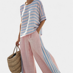 Γλυκύτητα και ελαφρότητα σε κάθε βήμα. Το σετ Daisy στους τόνους του ροζ και του γαλάζιου συνδυάζει ένα τοπ με κυματιστές γραμμές με φαρδιά και αφράτα παντελόνια, δημιουργώντας μια φρέσκια και άνετη αισθητική ιδανική για ηλιόλουστες ημέρες δίπλα στη θάλασσα.