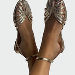Αναδείξτε την καλοκαιρινή σας εμφάνιση με αυτά τα υπέροχα χρυσά σανδάλια. Ο μοναδικός σχεδιασμός τους με λωρίδες δημιουργεί μια αίσθηση κομψότητας και πολυτέλειας, ενώ το ankle strap εξασφαλίζει άνεση και σταθερότητα σε κάθε βήμα.