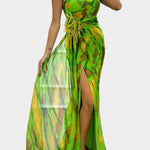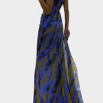 μαγνητίζει τα βλέμματα με τον ζωηρό του σχεδιασμό σε μπλε και πράσινους τόνους. Η αέρινη γραμμή και το εντυπωσιακό κόψιμο δημιουργούν μια απόλυτα κομψή και τολμηρή εμφάνιση για κάθε ιδιαίτερη περίσταση.