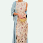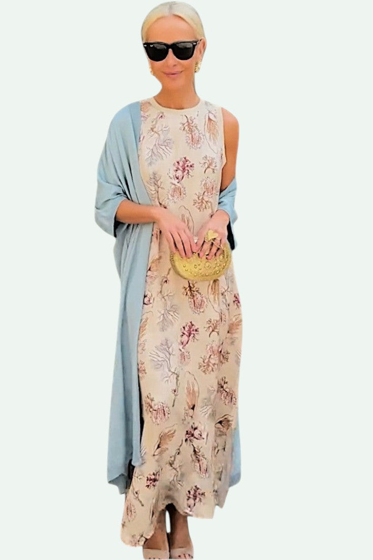 Αποπνέοντας κομψότητα και καλοκαιρινή ανεμελιά, αυτό το σύνολο με μακρύ λουλουδάτο φόρεμα και ελαφρύ μπουφάν είναι ιδανικό για κάθε περίσταση — από ένα brunch στη βεράντα μέχρι μια απογευματινή βόλτα στο νησί.
