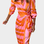 είναι ο ορισμός της σύγχρονης κομψότητας. Με έντονα χρώματα ροζ και πορτοκαλί και εντυπωσιακό σχέδιο περιτύλιξης, αυτό το φόρεμα αναδεικνύει τη θηλυκότητα και την αυτοπεποίθηση σας.