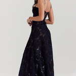 Αυτό το φόρεμα ξεχωρίζει με την φλοράλ βελούδινη επικάλυψη , τον εφαρμοστό κορσέ και τις λεπτές τιράντες . Κομψό και εντυπωσιακό, είναι ιδανικό για βραδινές εκδηλώσεις και αξέχαστες βραδιές .