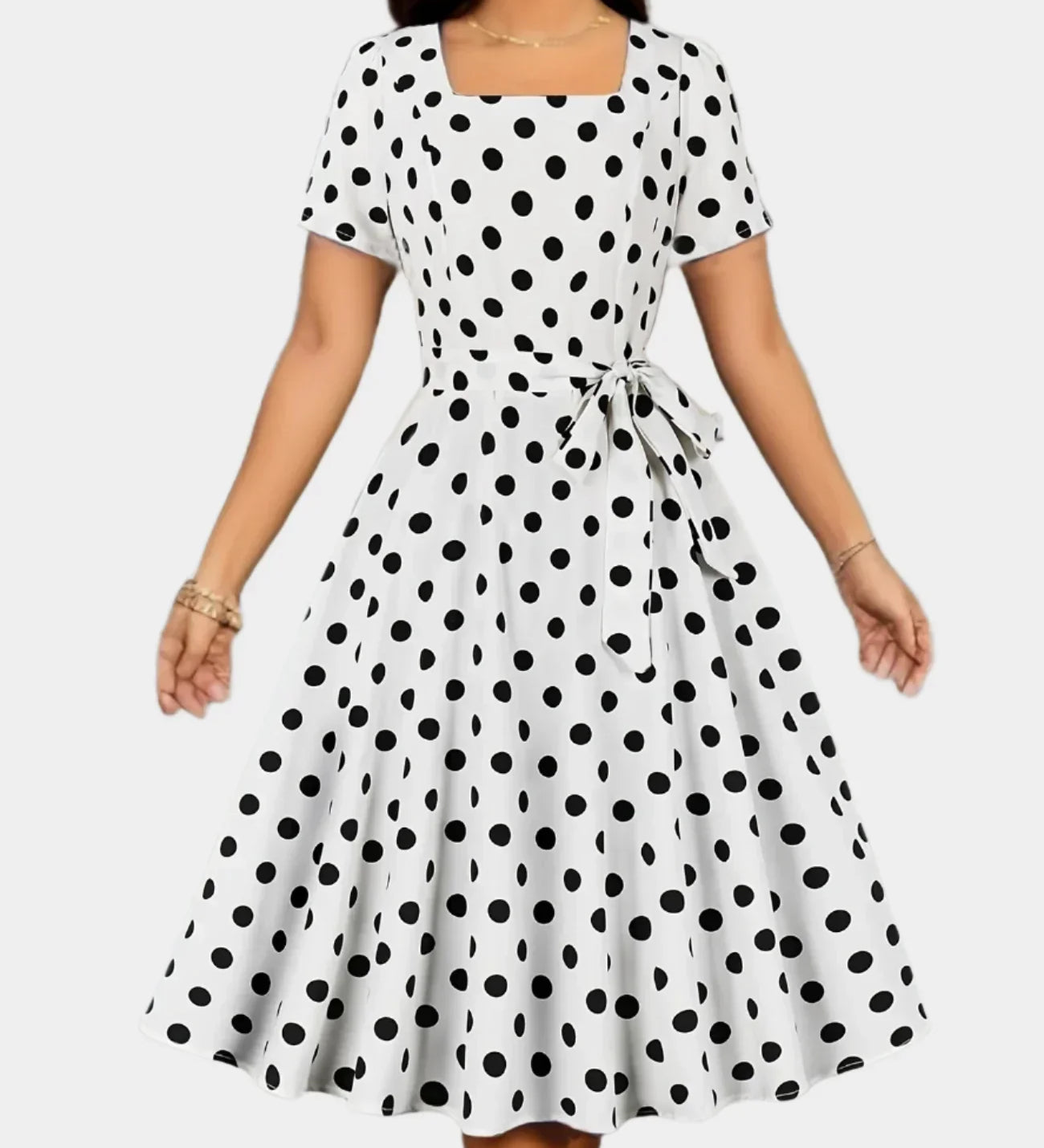 Ρετρό Πουά Φόρεμα με Ζώνη και Τετράγωνη Λαιμόκοψη