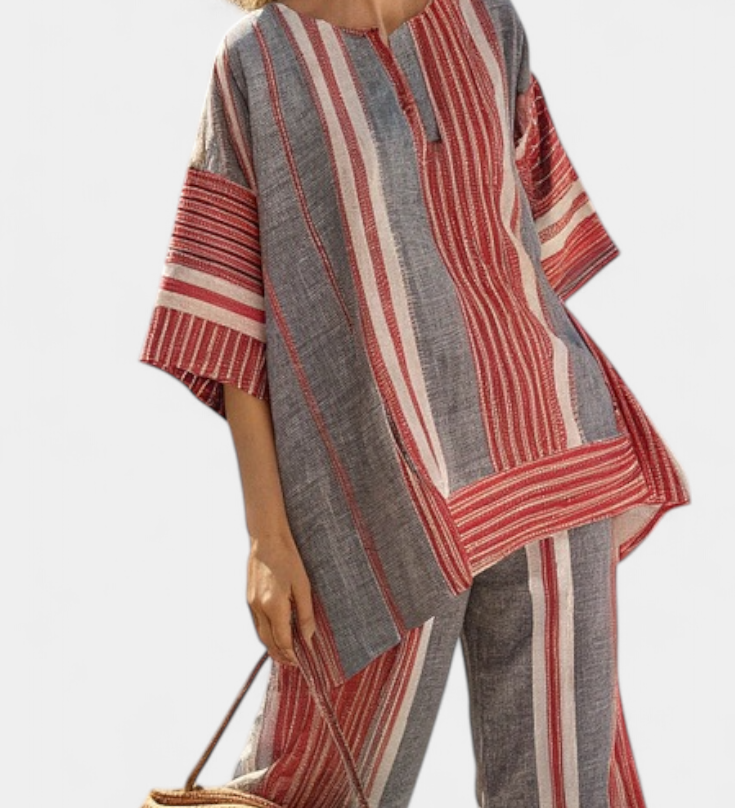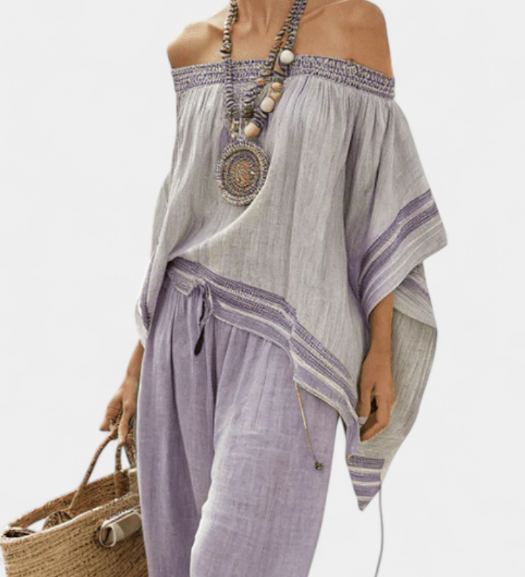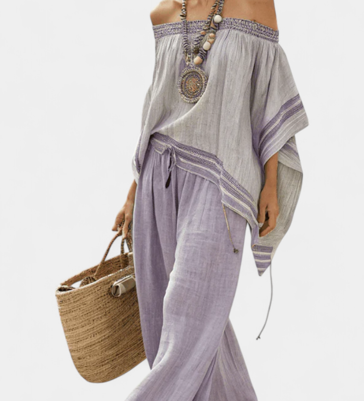 Σαλονάκι από μπαμπού με ρίγες, με ανοιχτούς ώμους και φαρδιά παντελόνια για ένα κομψό και φρέσκο στυλ