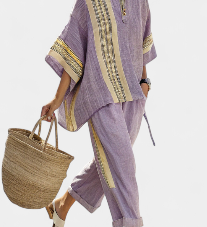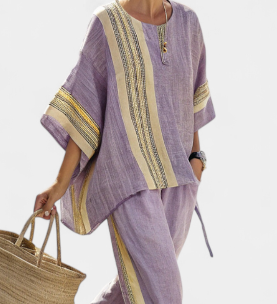 Σετ από λινό μπαμπού με μαγευτική λεβάντα και λεπτομέρειες σε κίτρινη ρίγα