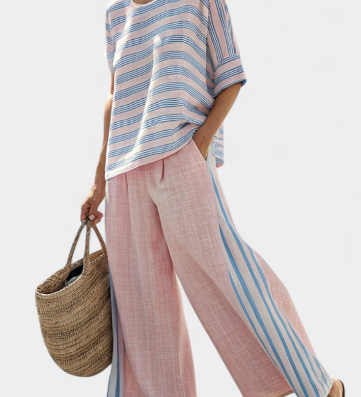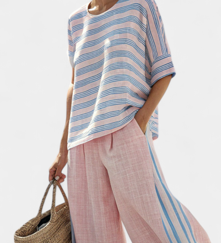 Σετ από λινό μπαμπού Daisy Μεσογειακό σε απαλό ροζ με κομψές γαλάζιες ρίγες