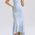 Ένα εντυπωσιακό φόρεμα με εφαρμοστή γραμμή και ανάγλυφο σχέδιο που αγκαλιάζει το σώμα με κομψότητα. Η σμιλευμένη μπούστα προσφέρει στήριξη και θηλυκή γραμμή, ενώ οι καλοσχεδιασμένες πιέτες στη μέση τονίζουν τη σιλουέτα. Η ασύμμετρη φούστα χαρίζει κίνηση και πολυτέλεια σε κάθε εμφάνιση.