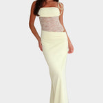 Αναδείξτε τη θηλυκότητα και την κομψότητά σας με αυτό το μακρύ φόρεμα σε απαλή παστέλ κίτρινη απόχρωση. Ο συνδυασμός της λεπτής δαντέλας στο μπούστο με το εφαρμοστό κάτω μέρος δημιουργεί μια άκρως ελκυστική και εκλεπτυσμένη εμφάνιση, ιδανική για βραδινές εξόδους ή ειδικές περιστάσεις.