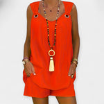 Το απόλυτο summer chic σύνολο που συνδυάζει φρεσκάδα και κομψότητα. Το αμάνικο μπλουζάκι με V λαιμόκοψη αναδεικνύει το ντεκολτέ με διακριτικό τρόπο, ενώ το σορτς προσφέρει άνετη εφαρμογή και θηλυκή γραμμή. Ένα μοντέρνο σετ για κάθε στιγμή της ημέρας.