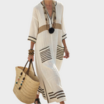 Απολαύστε την καλοκαιρινή αύρα με αυτό το κομψό ριχτό καφτάνι. Με διακριτικές μπλε ρίγες και boho αισθητική, είναι η ιδανική επιλογή για διακοπές δίπλα στη θάλασσα ή βόλτες στα νησιωτικά σοκάκια.