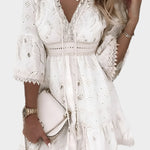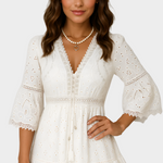 Αγκαλιάστε τη διαχρονική κομψότητα με αυτό το υπέροχα σχεδιασμένο μίνι φόρεμα με δαντέλα. Διαθέτει λεπτή κεντημένη δαντέλα, θηλυκή λαιμόκοψη V και φαρδιά μανίκια – ιδανικό για ιδιαίτερες περιστάσεις, καλοκαιρινά ραντεβού ή bridal εμφανίσεις.